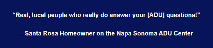 Una de las razones por las que puede que esté viendo el amor por ADU en las noticias locales últimamente es porque nuestras ciudades y condados aquí en Napa y Sonoma se encuentran actualmente en medio de la planificación de su Elemento de Vivienda. Este es un proceso que se lleva a cabo en ciclos de ocho años y permite que nuestras jurisdicciones locales compartan con el Estado de California cómo nuestras jurisdicciones planean tomar medidas para satisfacer nuestras necesidades de vivienda. Para obtener más información sobre las necesidades de vivienda locales y cómo nuestras jurisdicciones se han unido para abordar este proceso, consulte este sitio web súper informativo . Nuestras jurisdicciones locales están en medio de la solicitud de comentarios y opiniones de miembros de la comunidad como usted para informar sus planes del Elemento de Vivienda, así que si desea compartir sus ideas, ¡ahora es el momento de comunicarse con su ciudad o condado para saber cómo puede hacerlo!